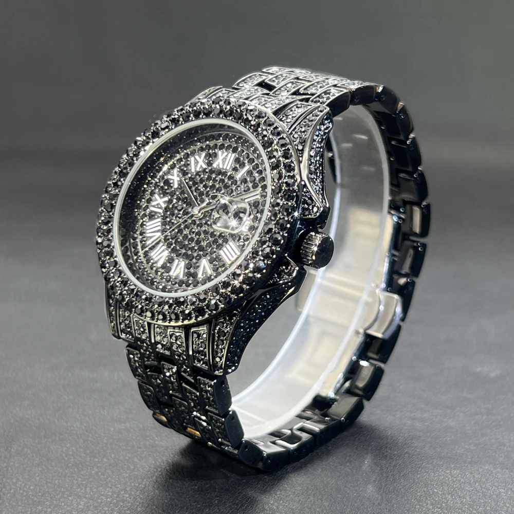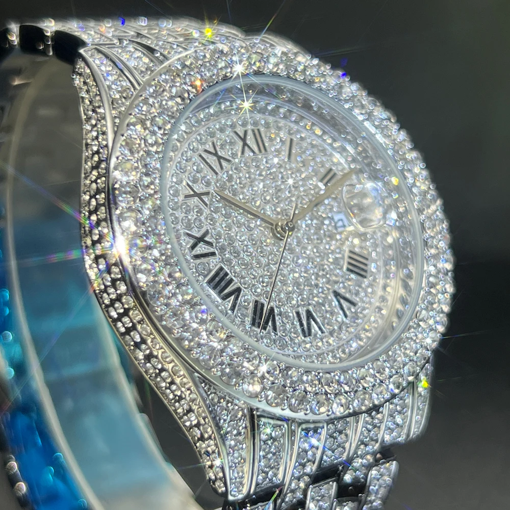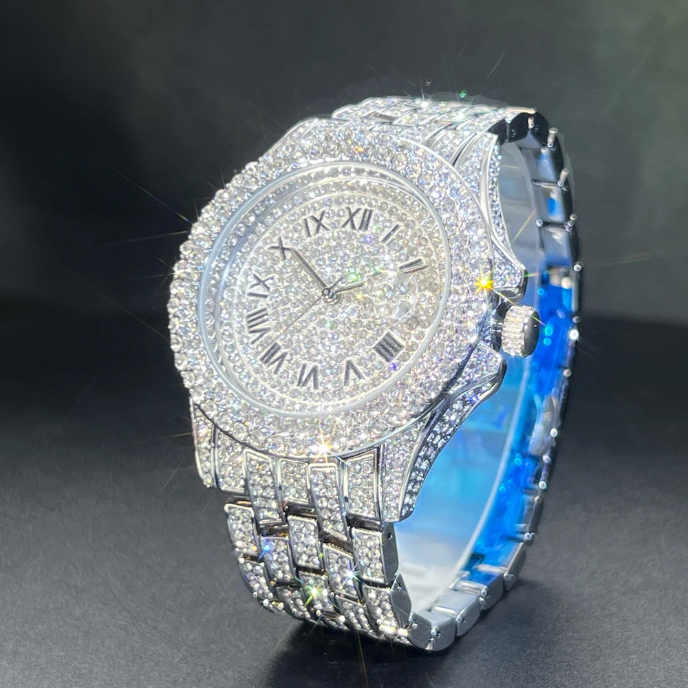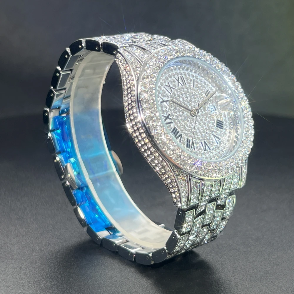 Make a statement with the MISSFOX V370 full diamond men’s watch, a perfect fusion of luxury and urban style. Featuring a stainless steel case and band with dazzling bling detailing, this watch stands out with its round dial, Roman numeral markers, and sleek needle hands, exuding elegance and confidence for any occasion.