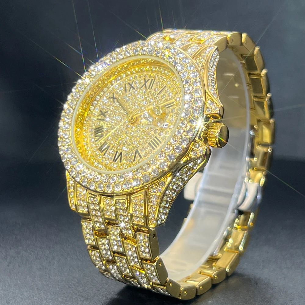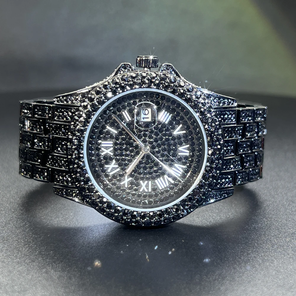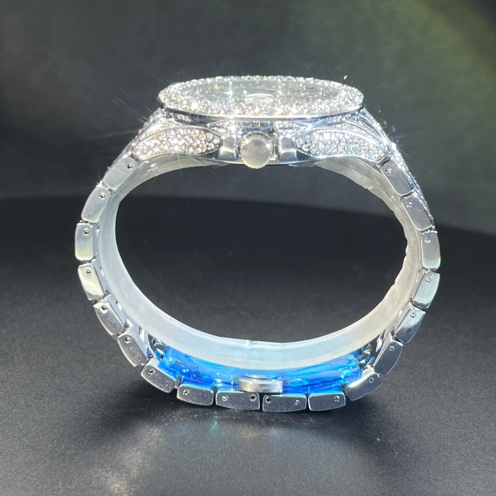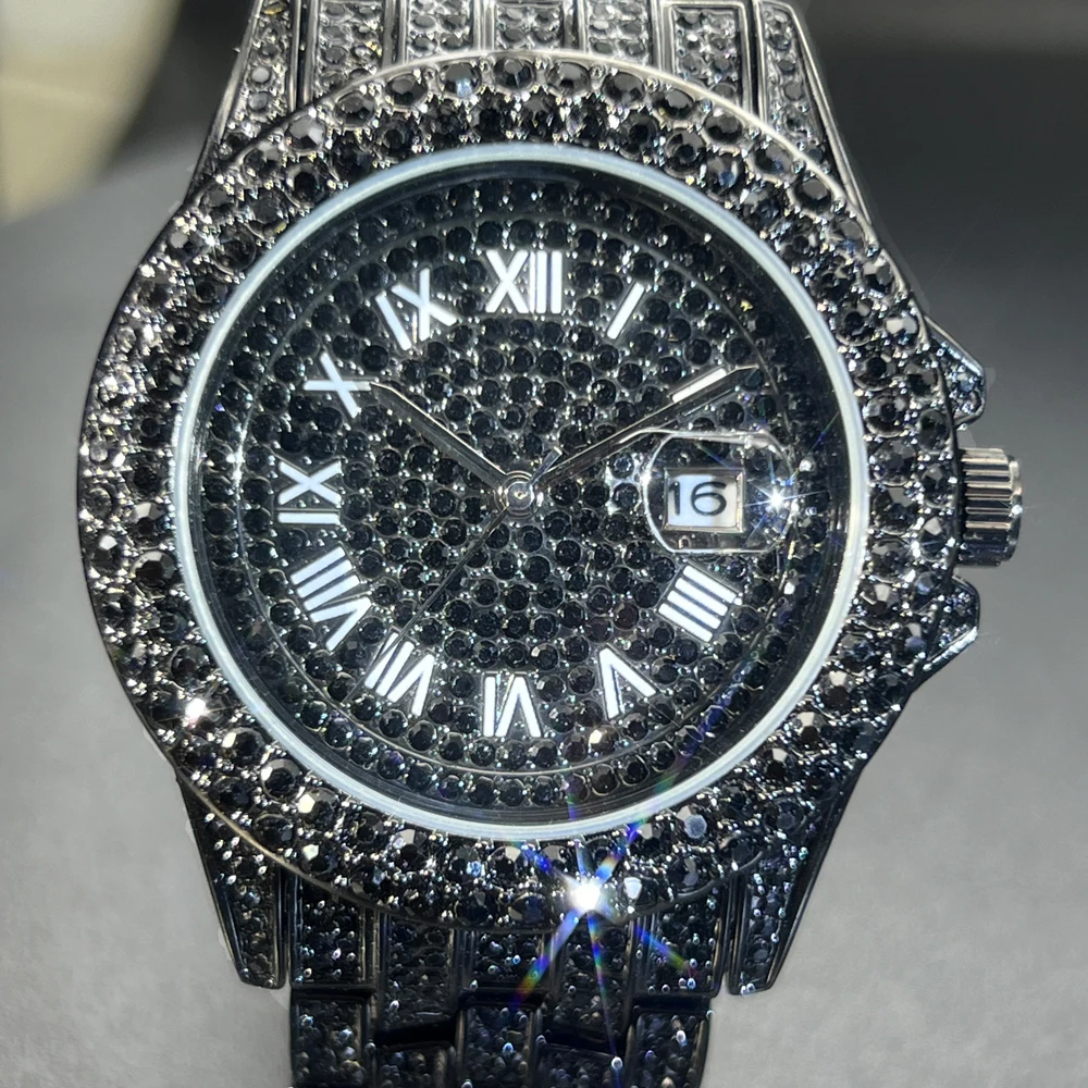 Make a statement with the MISSFOX V370 full diamond men’s watch, a perfect fusion of luxury and urban style. Featuring a stainless steel case and band with dazzling bling detailing, this watch stands out with its round dial, Roman numeral markers, and sleek needle hands, exuding elegance and confidence for any occasion.